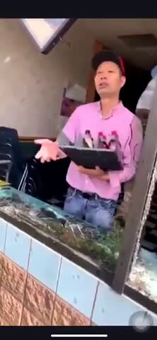 Asian man trying to clean up his looted store as black man comes along, steals in front of him and laughs in his face.